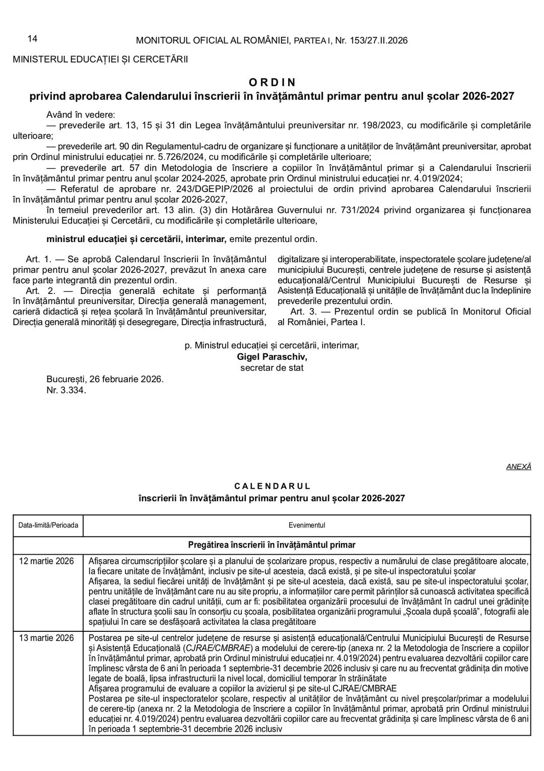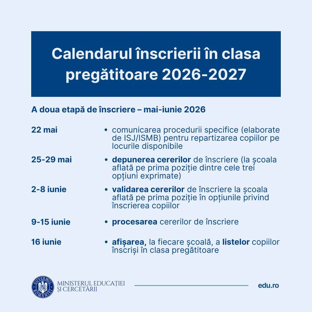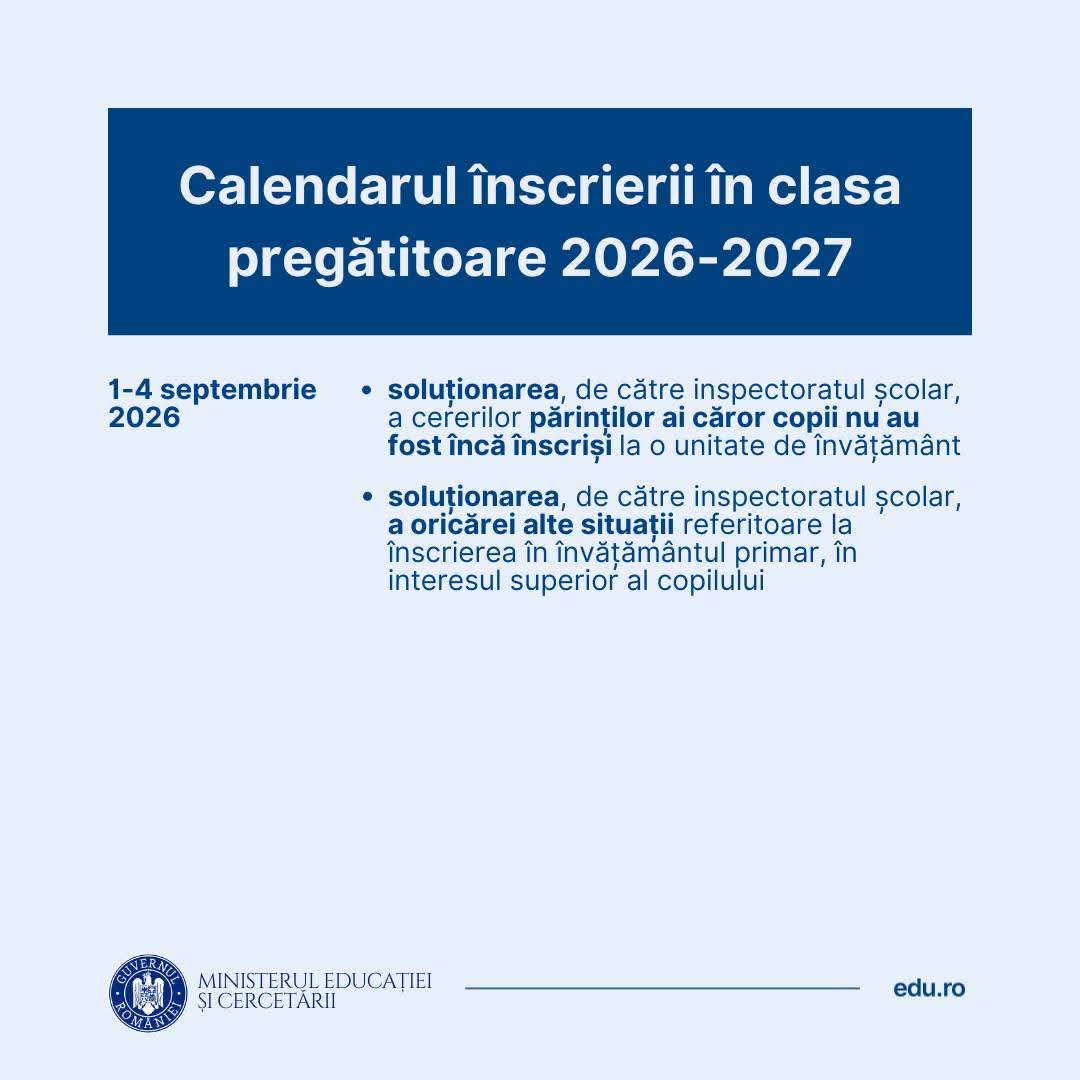 🗓️ Calendarul pentru înscrierea copiilor în clasa pregătitoare în anul școlar 2026 – 2027 a fost aprobat. 👇